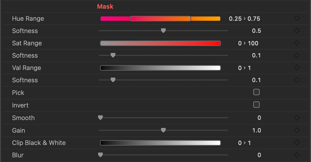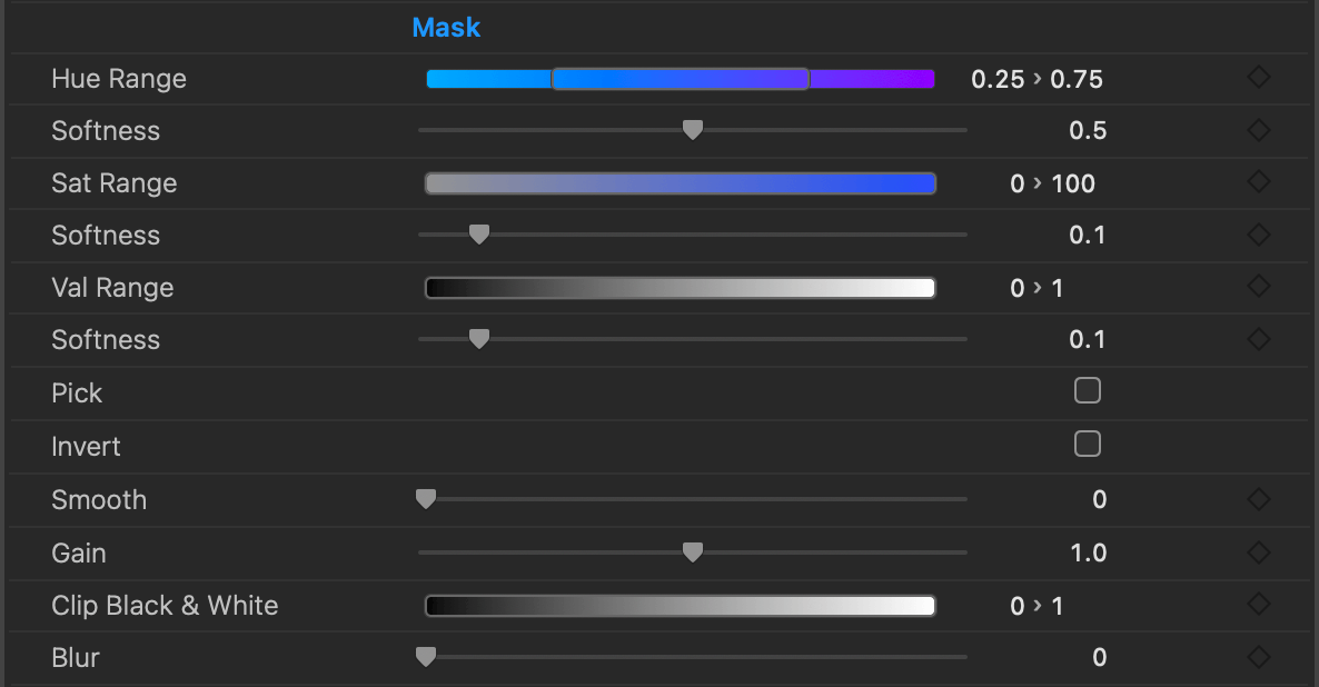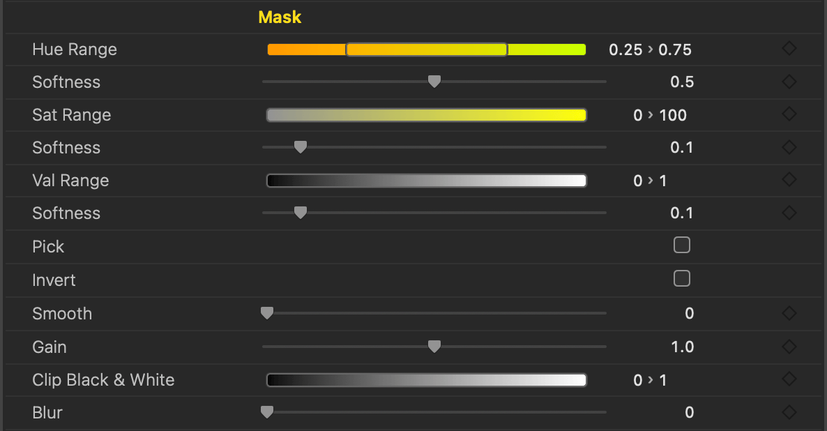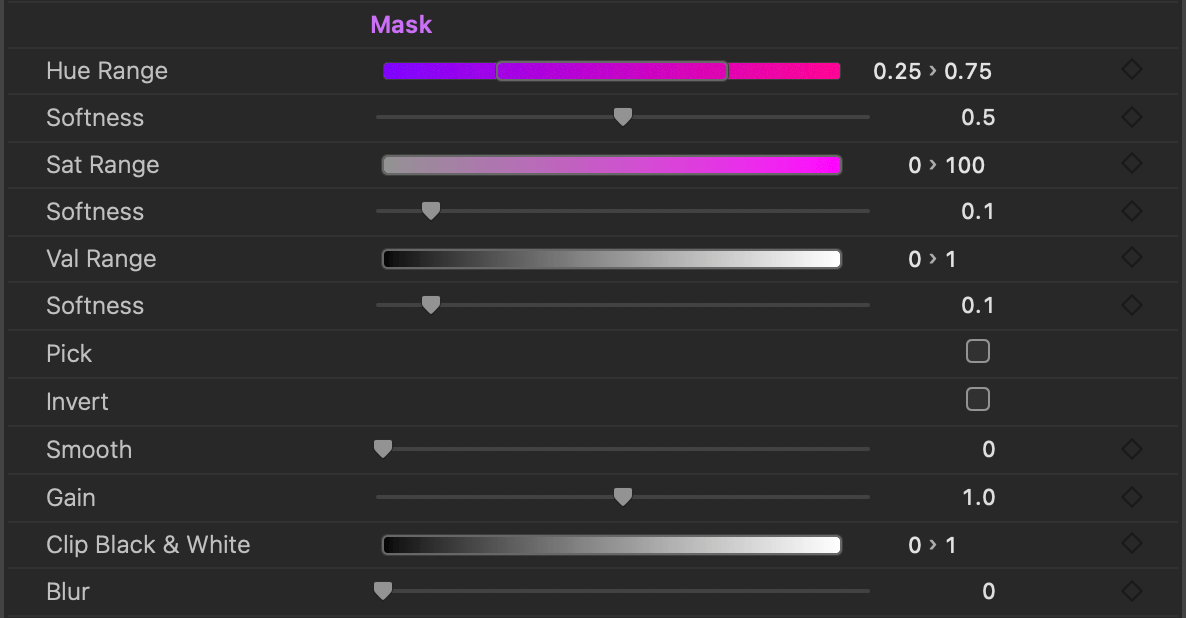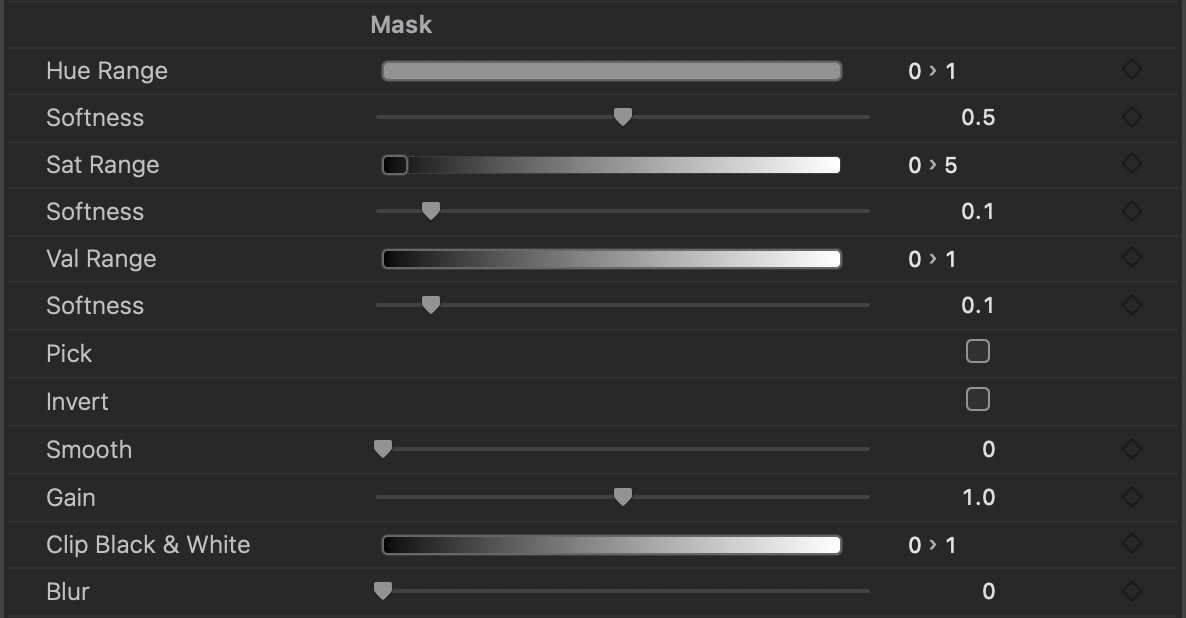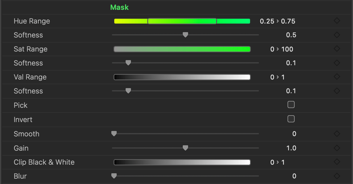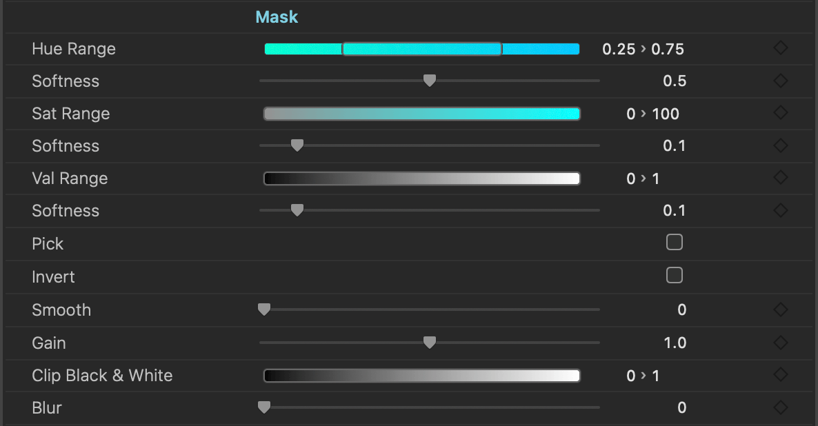 - Mask Refinement - Set the hue, saturation and value range for each band or pick directly from the image. Then refine the mask using familiar keying tools like gain, clip black & white, invert and blur.