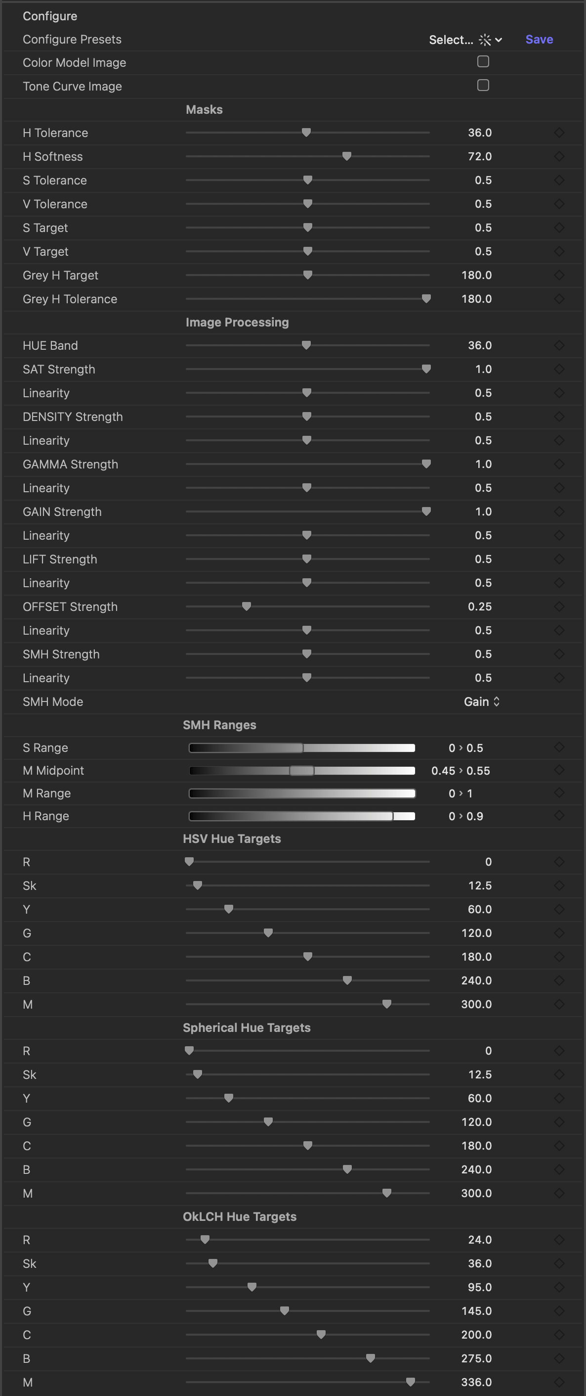 - Customisation - Set the hue targets for each color model, choose default ranges and adjust the strength and response curve of the controls. Configuration can be saved as a preset for different workflows.