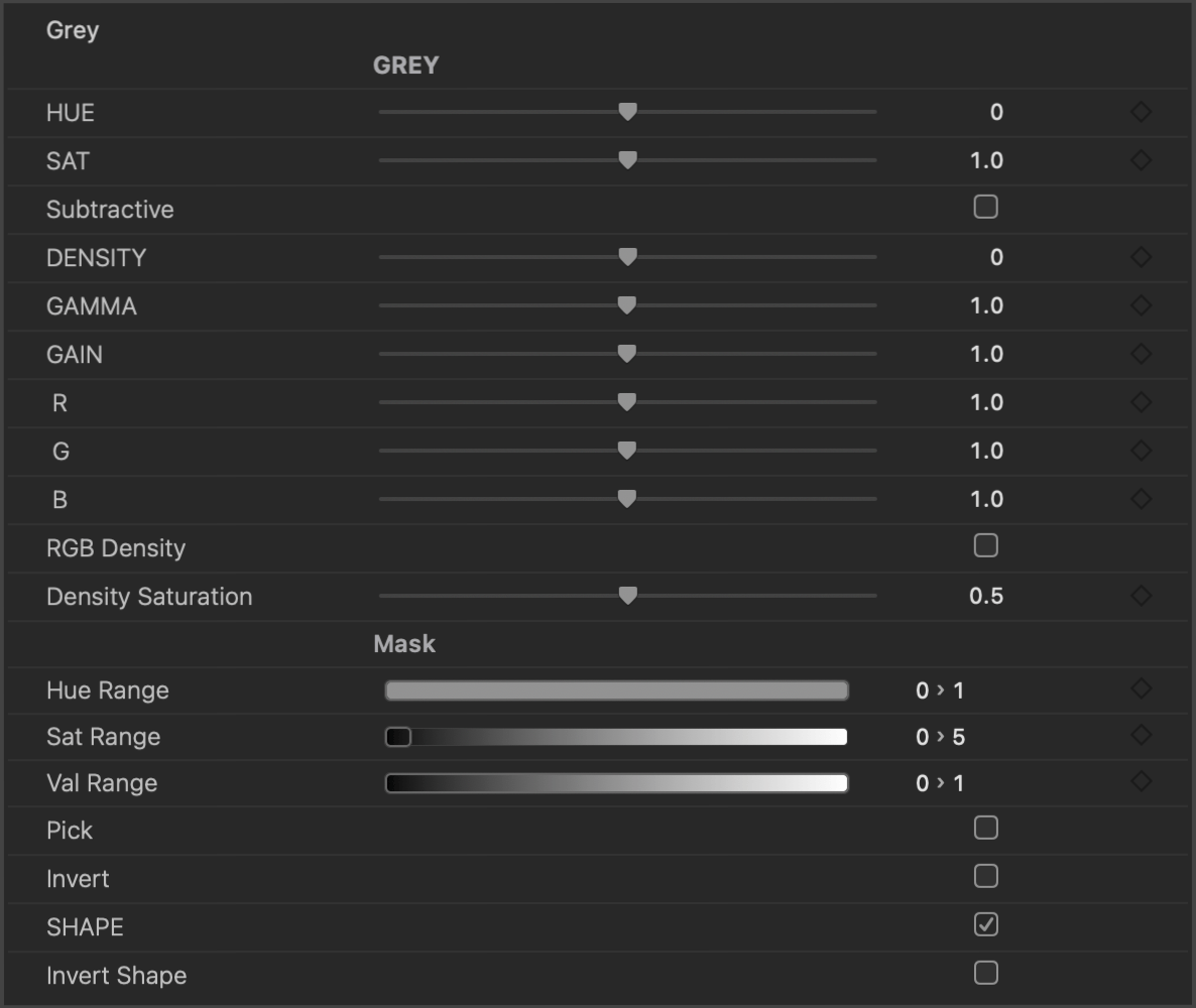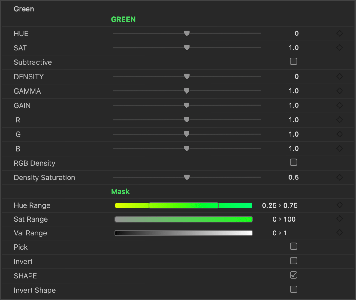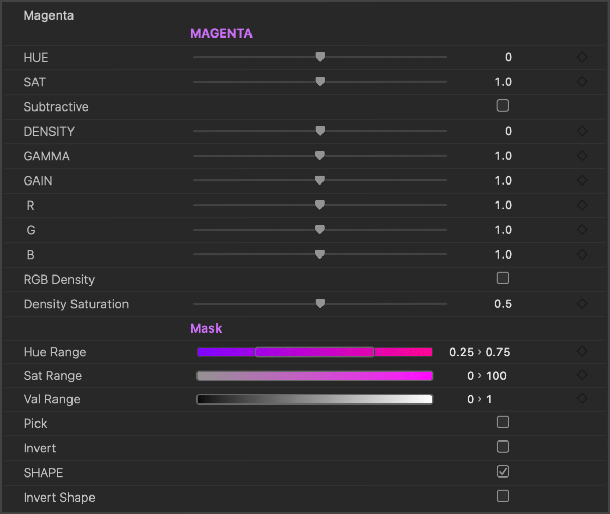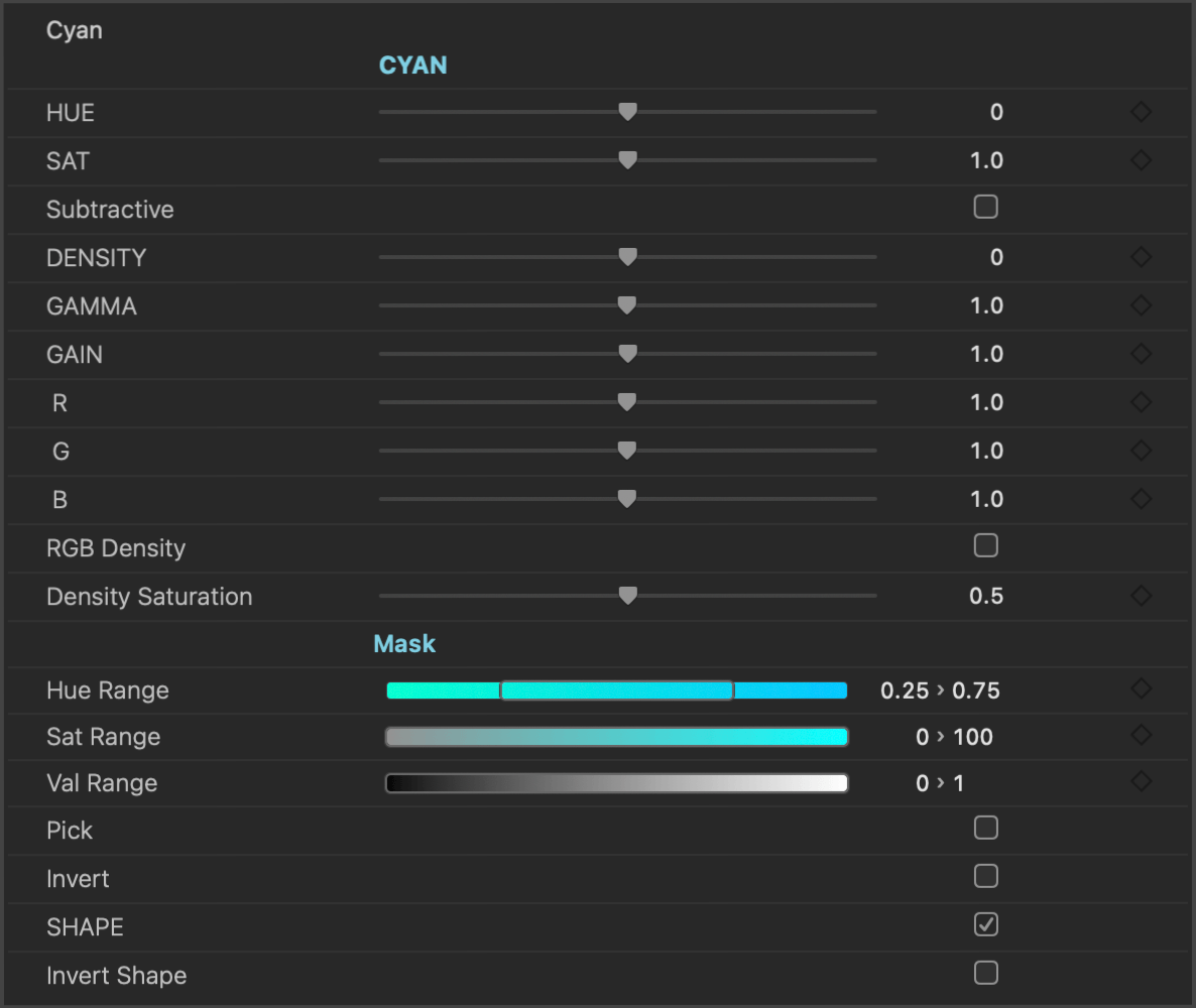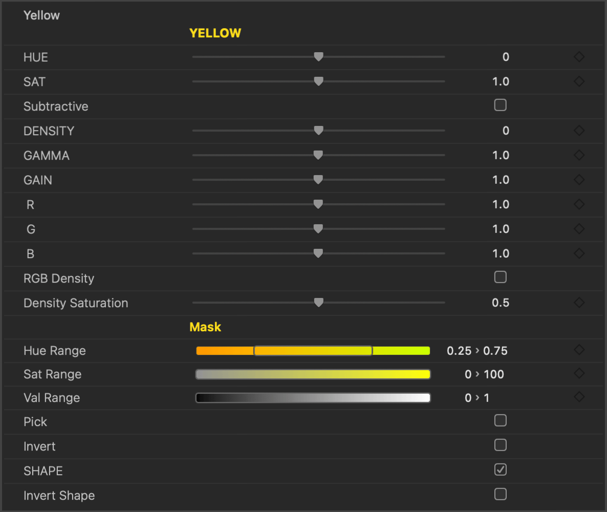- Shape Mask - can be enabled and inverted independently for each hue band.