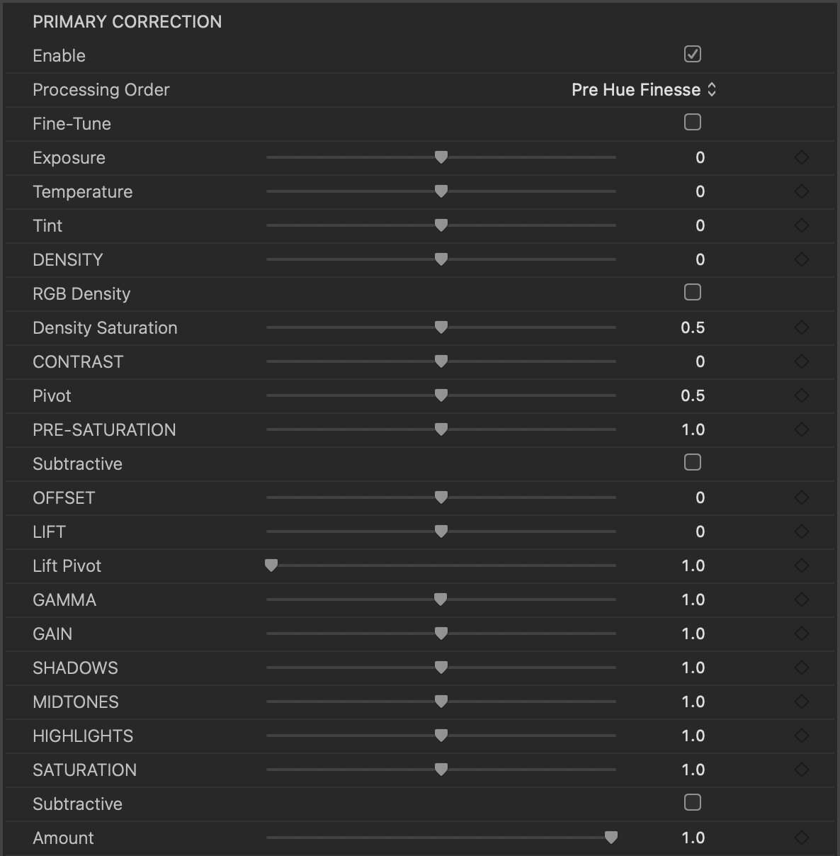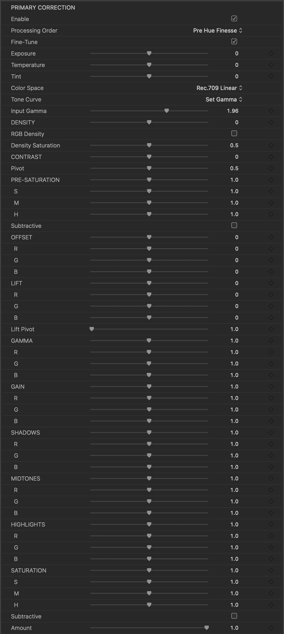 NB. Primary Correction has its own Tone Curve menu and White Balance is always linear.